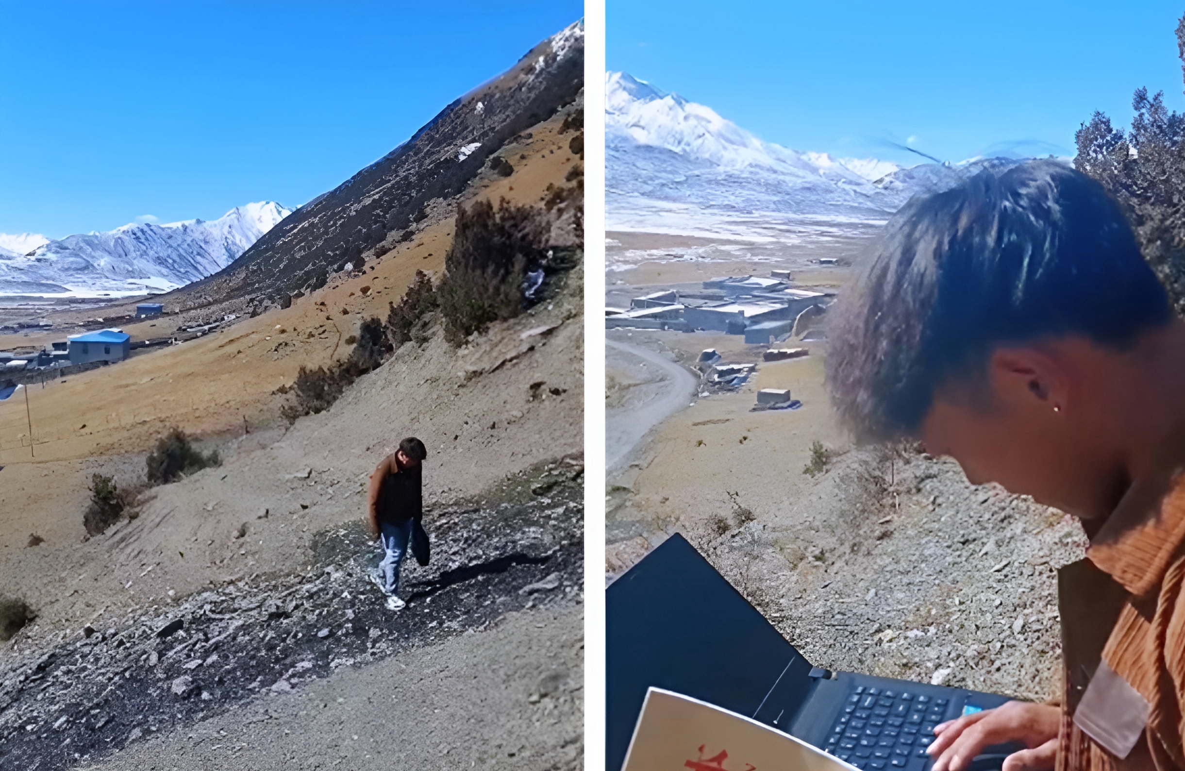 扎西朗加爬上山寻找信号