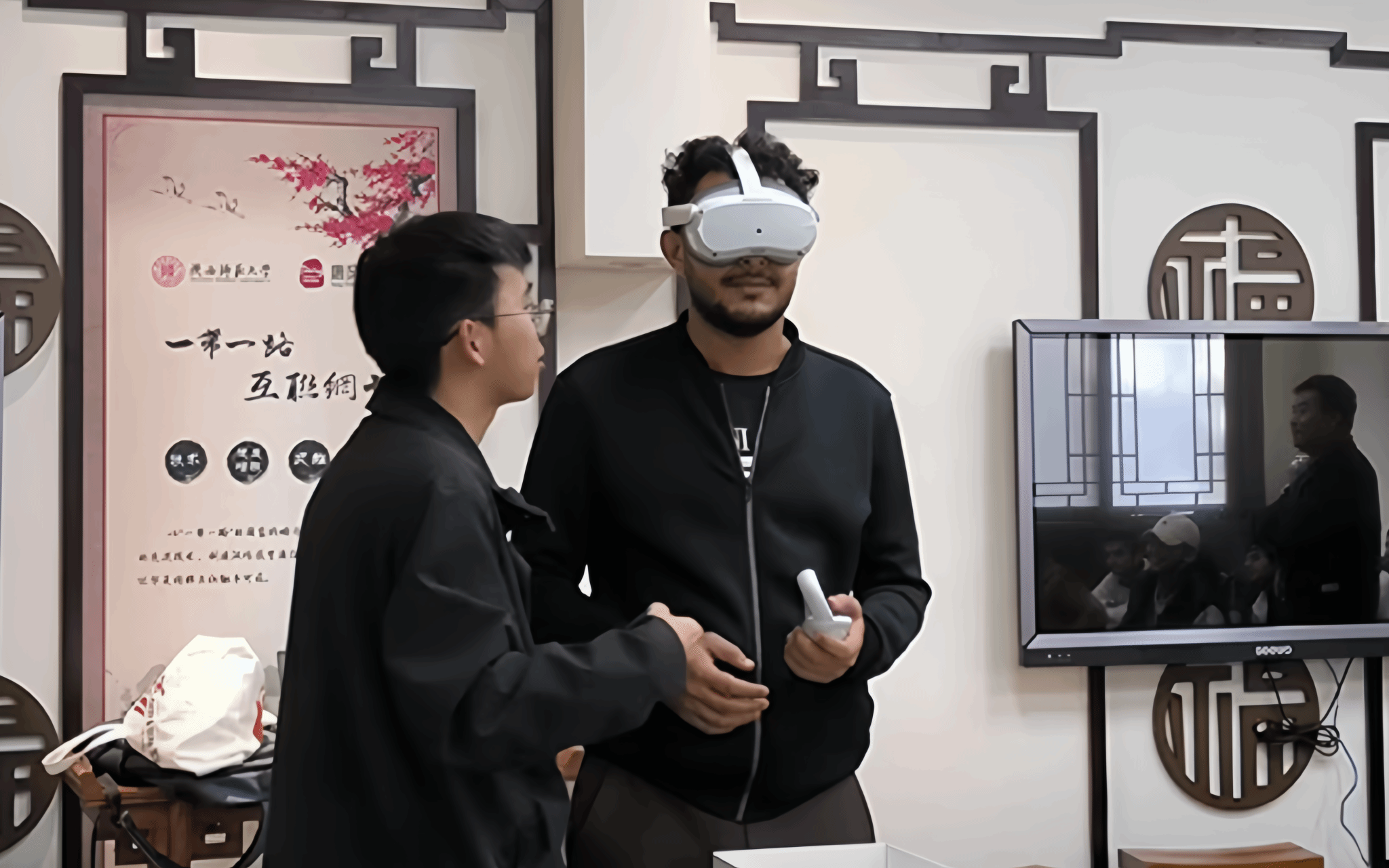 当“文房四宝”遇上“元宇宙”,中华书法文化的无限魅力,通过一个小小的“VR”眼镜被呈现在大家面前。在国际汉语文化学院唐风汉语教室,计算机科学学院孙增国副教授团队为国际学生们带来了一场别开生面的书法VR系统体验活动。该项目依托于民歌智能计算与服务技术文化和旅游重点实验室。同学们只需头戴显示器,持握手柄,即可在虚拟世界体验水墨字画创作,实现随时随地的书法练习。“书法艺术‘元宇宙’沉浸式体验空间,将中华传统文化与数字技术进行了有机融合,是利用新形式、新手段弘扬传统文化、讲好中国故事的重要转化成果,也是新质生产力在文化体验方面的重要表现。”孙增国说。