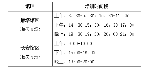 1.班级负责人就近选择在雁塔、长安两馆区总服务台进行现场预约,总服务台每天工作时间为8:00-22:00,该时段内随时接受预约申请;