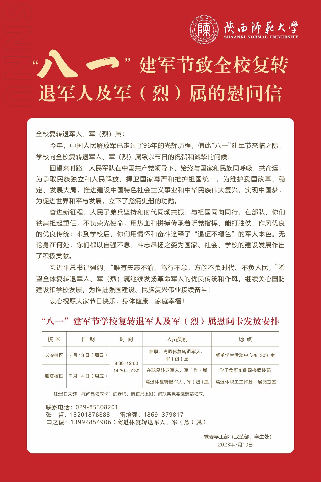 “八一”建军节致全校复转退军人及军(烈)属的慰问信