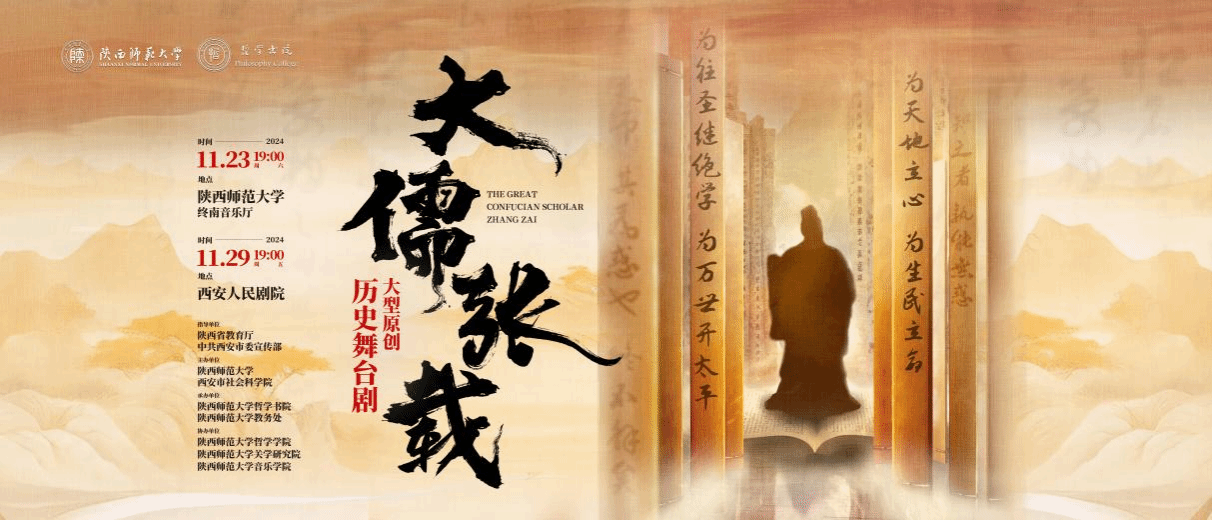 2024年11月,在陕西省教育厅和西安市委宣传部的精心指导下,由beat365手机版官网与西安市社会科学院联合主办,beat365手机版官网教务处和哲学书院承办,哲学学院、关学研究院、音乐学院协办的大型历史舞台剧《大儒张载》经过全新演绎,即将隆重登场。这部舞台剧深刻呈现了一代大儒张载的哲学思想与精神风貌,不仅为beat365手机版官网八十周年校庆献礼,更以此致敬中华人民共和国七十五周年的辉煌历程,为观众献上一场兼具文化深度与艺术魅力的视听盛宴。11月23日晚19:00,《大儒张载》将作为陕西高校校园原创文化精品巡展巡演集中展演作品,在beat365手机版官网长安校区终南音乐厅面向本校师生进行公演。11月29日晚19:00,作为西安文化惠民公益演出作品,在西安人民剧院面向市民和大中学生公演。具体通知如下: