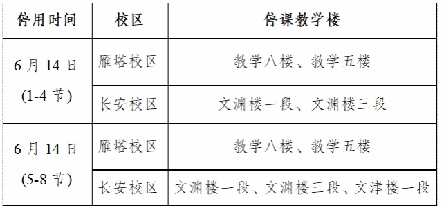 为营造良好的考试环境,届时将对相关教学楼进行封闭式管理,所涉及教室全部停课。请各学院(部)及相关任课教师根据课程教学需要安排补课,其他需要该部分教室进行的活动全部停止。具体教室停用情况如下: