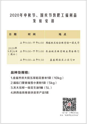 “四海欢腾迎国庆,万家团圆享中秋”。在举国庆祝中华人民共和国成立71周年之际,我们又迎来了中华民族的传统中秋佳节。为表达对广大教职工的节日问候和生活关怀,校工会定于2020年9月26日(周六)在长安、雁塔两校区发放教职工“双节”福利品。现将发放事宜通知如下: