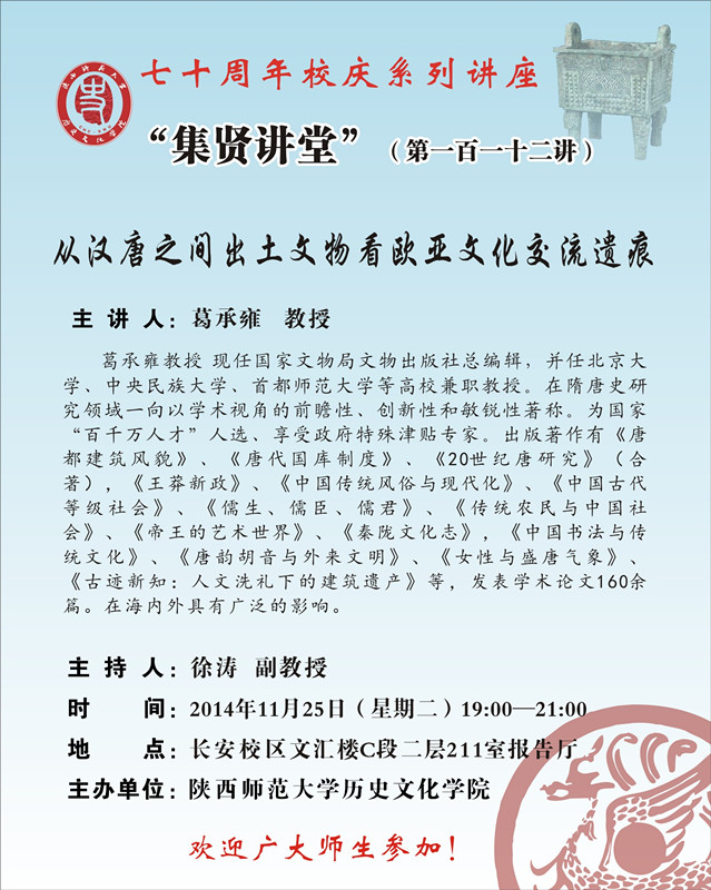 讲座题目:集贤讲堂:从汉唐之间出土文物看欧亚文化交流遗痕