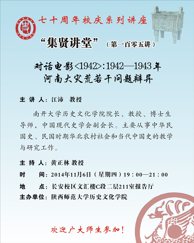 讲座题目:历史文化学院迎70周年校庆系列学术讲座之集贤讲堂105讲:对话电影:1942—1943年河南大灾荒若干问题辩异