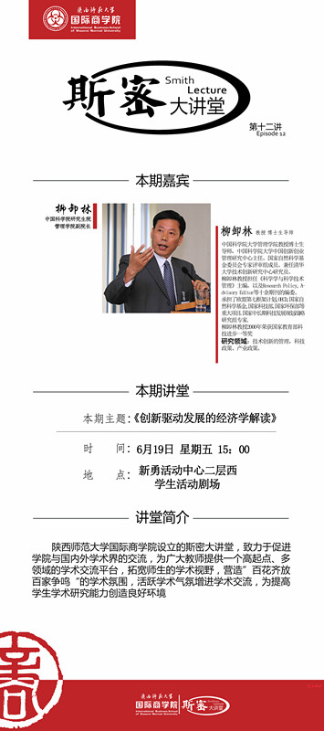 讲座题目:国际商学院斯密大讲堂第十二讲预告:创新驱动发展的经济学解读