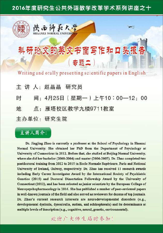 讲座题目:科研论文的英文书面写作和口头报告
