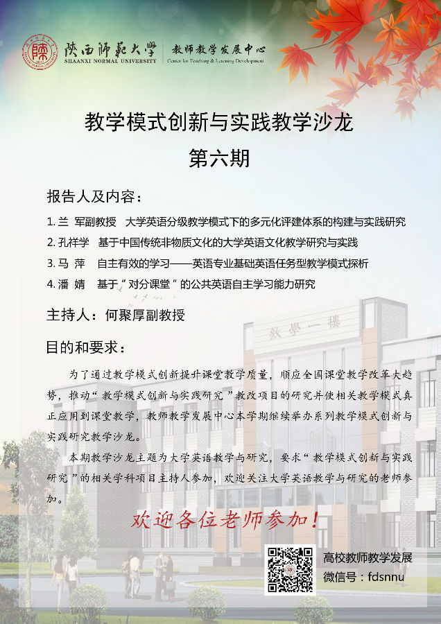 活动类别:教学模式创新与实践教学沙龙第六期:大学英语教学