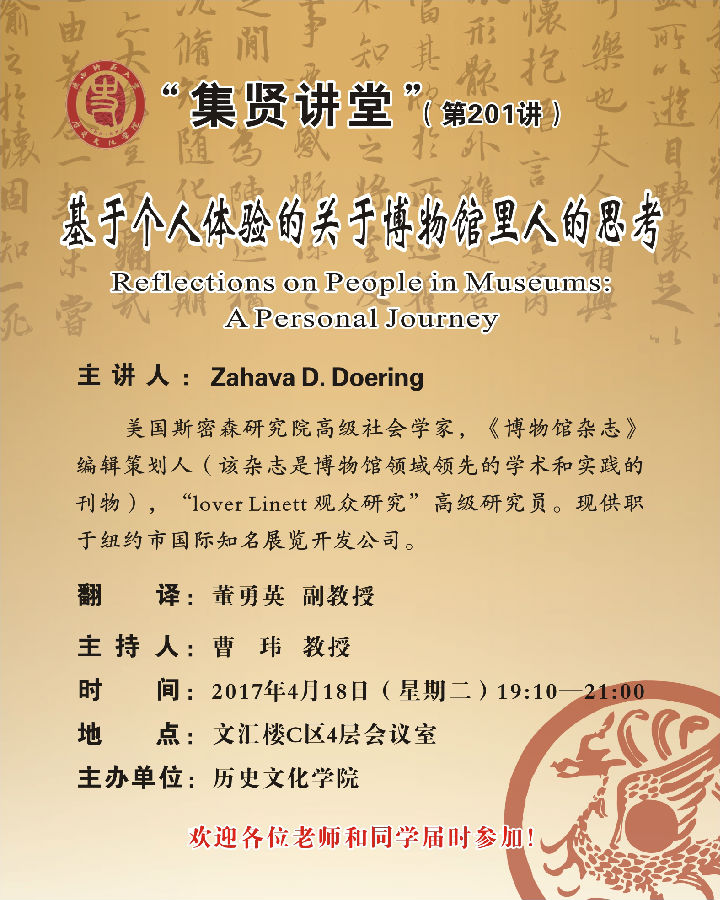 讲座题目:集贤讲堂第201讲:Reflections on People in Museums: A Personal Journey(基于个人体验的关于博物馆里人的思考)
