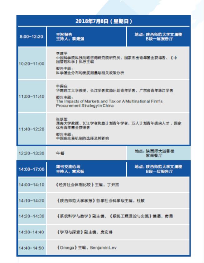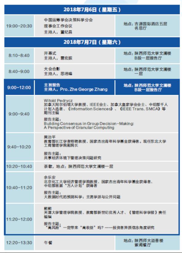 中国运筹学会决策科学分会学术年会暨行为经济与管理国际论坛于2018年7月6-8日在西安举办。会议的主要目的是交流决策科学各分支领域以及行为经济与管理领域的最新学术进展,促进跨学科方向的融合,探讨前沿性科研问题,展示我国决策科学相关领域的理论和方法的研究及应用推广的最新成果,同时也是来自全国各地决策科学分会理事和学者的一次难得聚会。