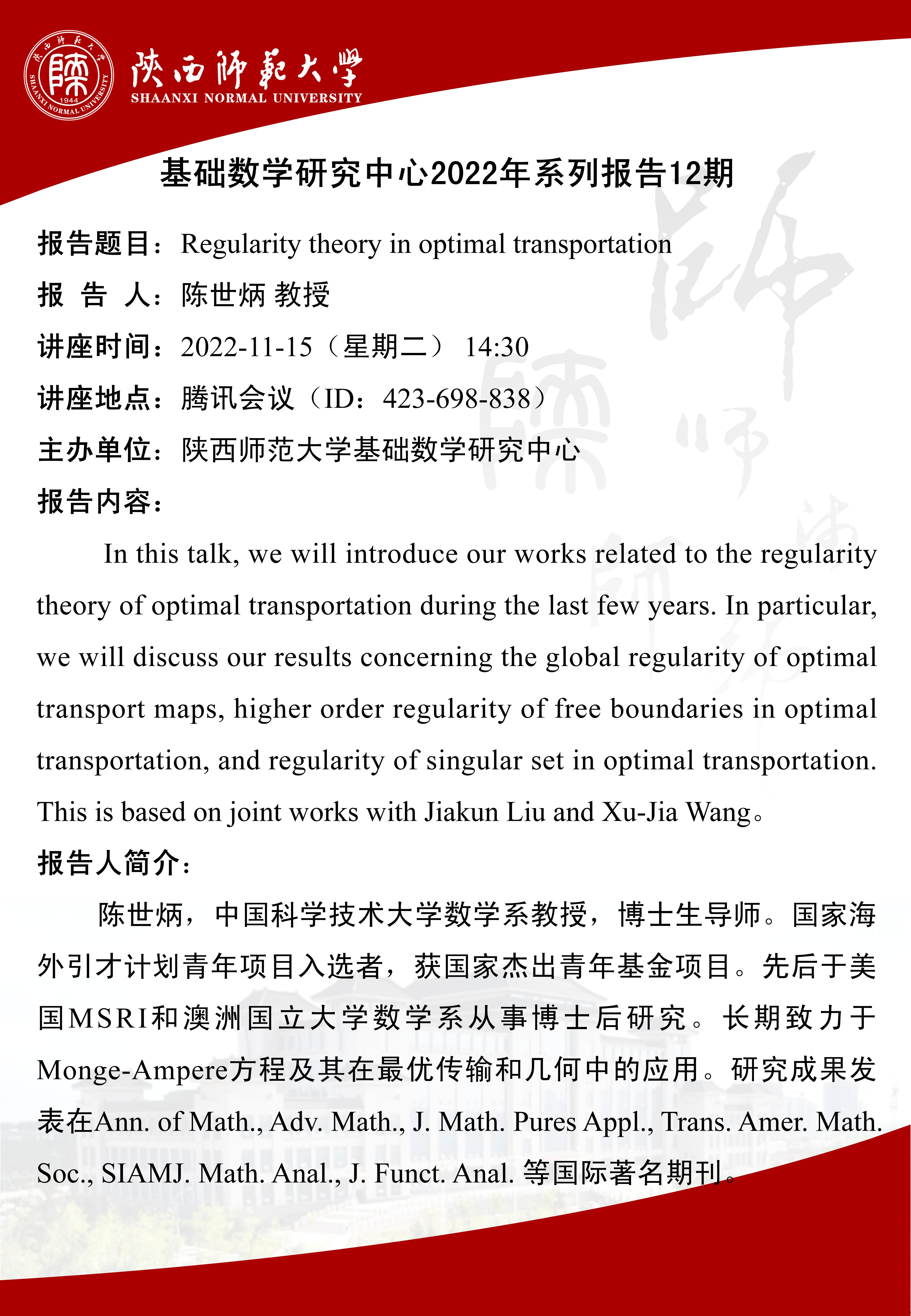 【学术活动月系列八】基础数学研究中心2022年系列报告12期-Regylarity theory in optimal transportation