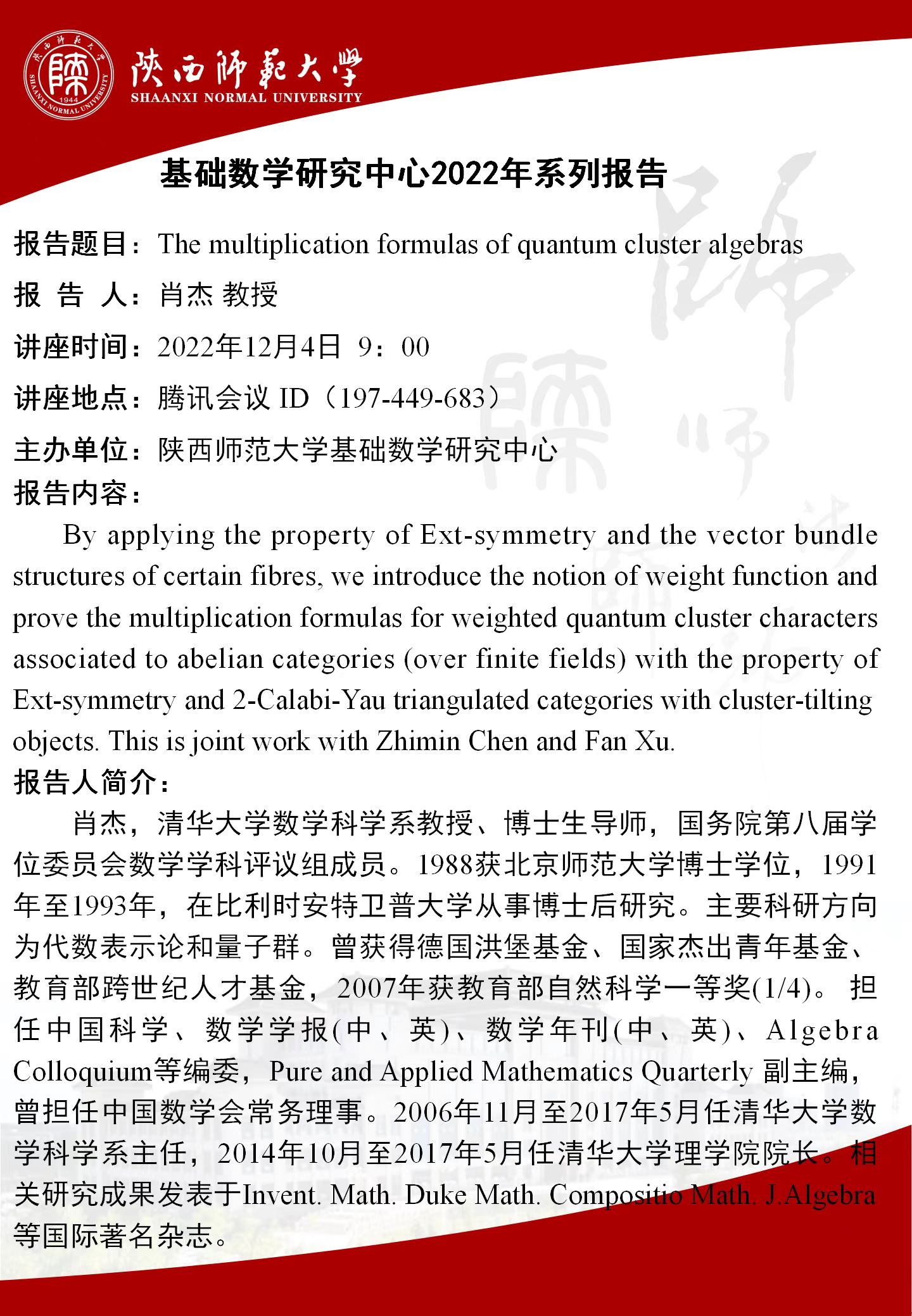 【学术活动月系列二十三】The multiplication formulas of quantum cluster algebras