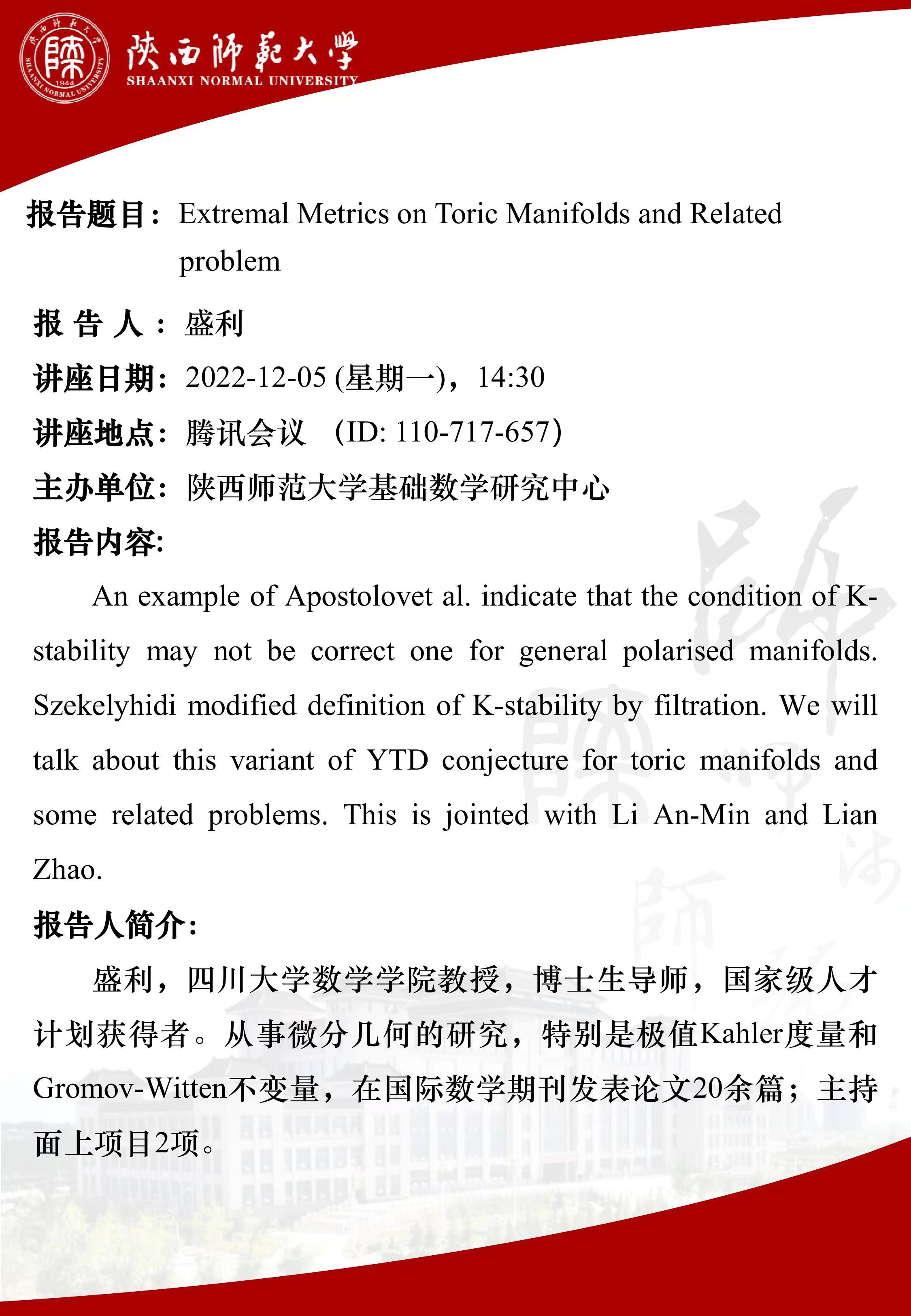 【学术活动月系列二十九】Extremal Metrics on Toric Manifolds and Related problem