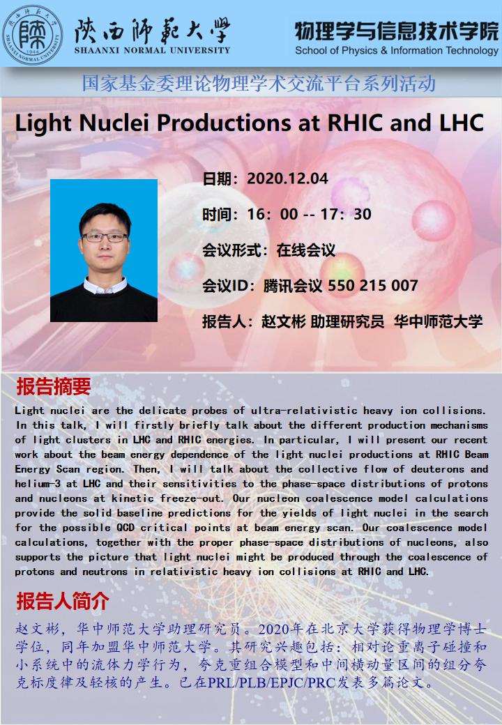 国家基金委理论物理学术交流平台系列活动预告:Light Nuclei Productions at RHIC and LHC