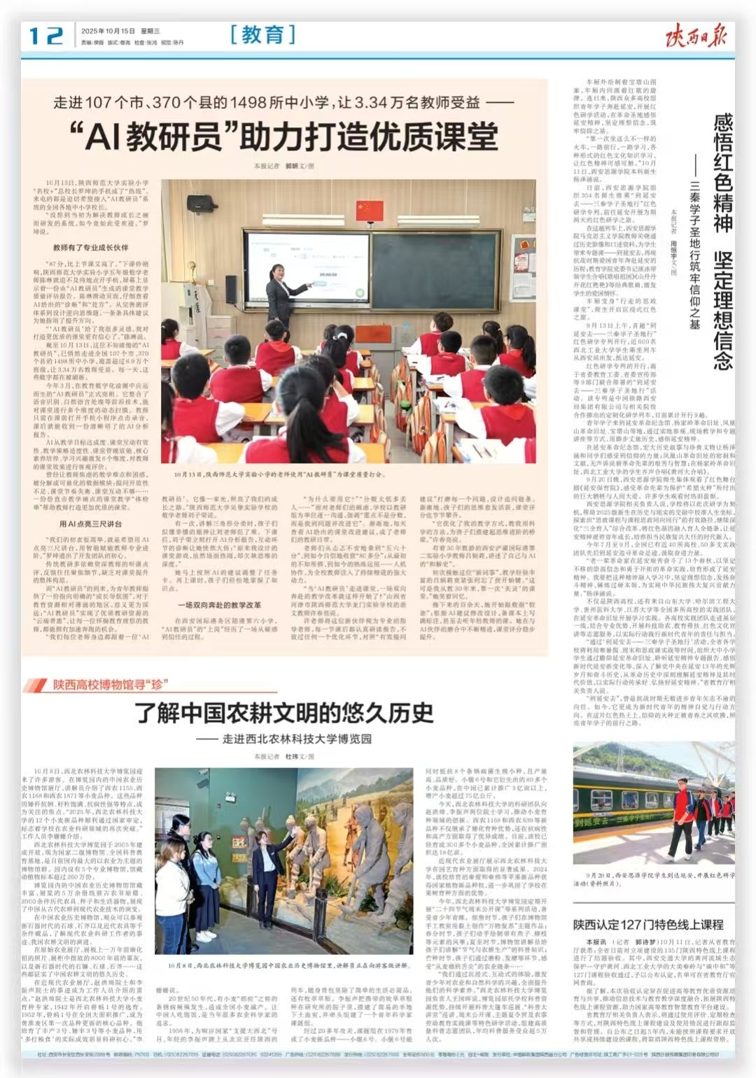 师大新闻网讯10月15日,《陕西日报》第12版以“‘AI教研员’助力打造优质课堂”为题,报道beat365自主研发的课堂教学质量分析工具“AI教研员”系统上线以来,已走进107个市、370个县的1498所中小学,让3.34万名教师受益。