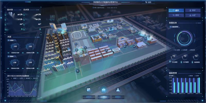 智慧供水:全程可控,用水保障更安心。学校针对设备老化、水压不足、管理方式陈旧等问题,历时3年对两校区的供水泵房、管道及管理终端进行全面升级改造,建成覆盖全校的智慧供水系统。通过规范化建设、科学化提升和智慧化运维,构建起从“供水泵站-管网-二次供水-表计”的全链条供水管理体系,实现从“水源”到“龙头”的全流程可视化管理。系统投用后,每年可减少约30万元的水损及20万元的运维费用,显著提升学校供水管理的智慧化水平和安全保障能力。