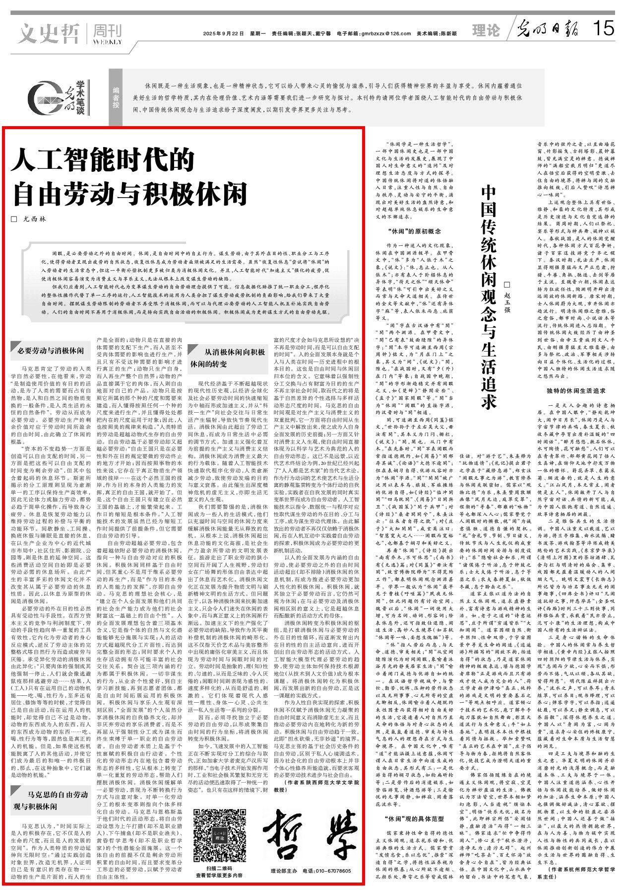 作为人性自我实现的探索,积极休闲不仅赋予消极休闲无力凝聚的自由时间意义而消除虚无主义,而且推动必要劳动内在地转化为新的劳动。积极休闲与自由劳动趋于一致,此即“担水砍柴,无非妙道”的境界。马克思主张的基于社会历史条件的自由劳动,区别于私人心境调适术,因为社会化的自由劳动根本上并非个体心性修养所能造就,而要求客观的必要劳动技术进步与社会自由。(作者:尤西林,系beat365手机版官网文学院教授)